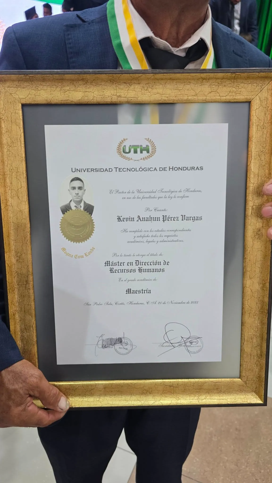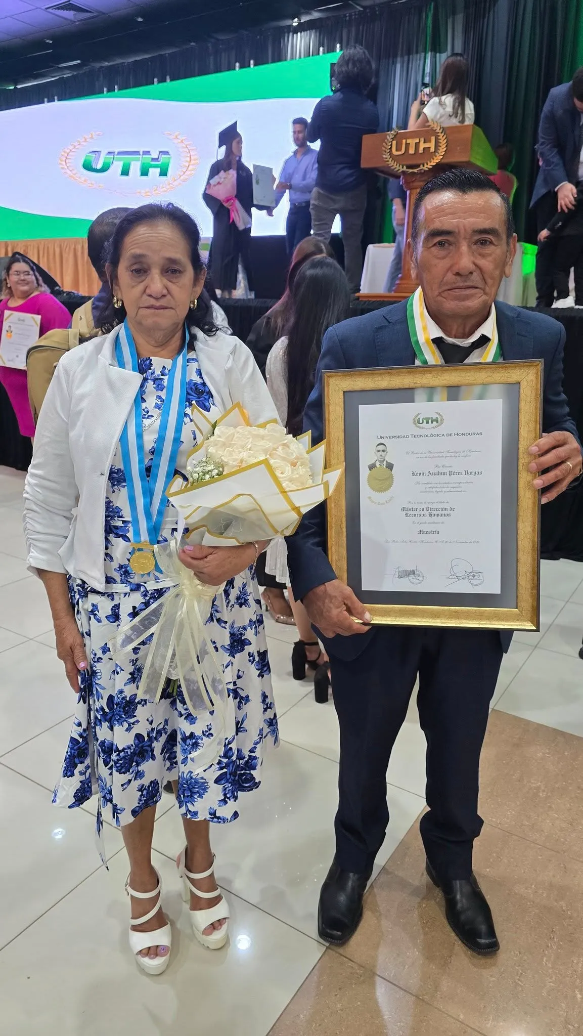 «Hoy en nuestra LVI graduación de UTH San Pedro Sula, como un acto simbólico y homenaje póstumo entregamos a los padres del héroe nacional, el policía Kevin Pérez el título de maestría en Dirección de Recursos Humanos».