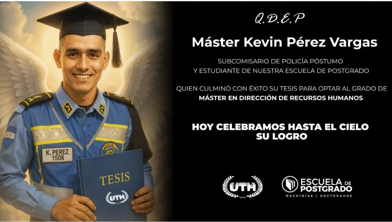 Redacción. La Universidad Tecnológica de Honduras (UTH) otorgó el título póstumo en el grado de máster al agente de de policía Kevin Pérez, fallecido en el cumplimiento del deber en San Pedro Sula, Cortés.