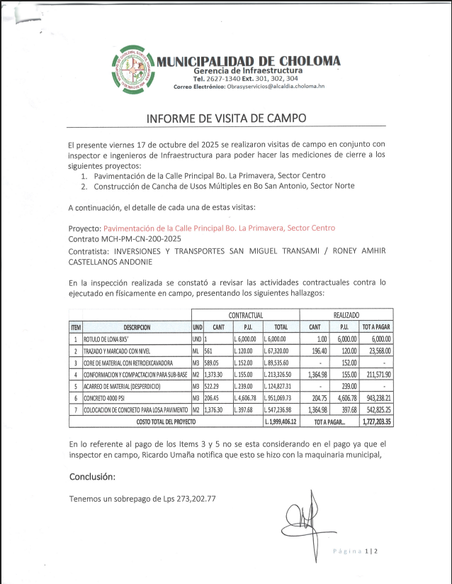 Según el informe, esta obra presentó un sobrepago de 273,202.77 lempiras, una cifra que nuevamente cuestiona los procesos de supervisión de la Alcaldía de Choloma.