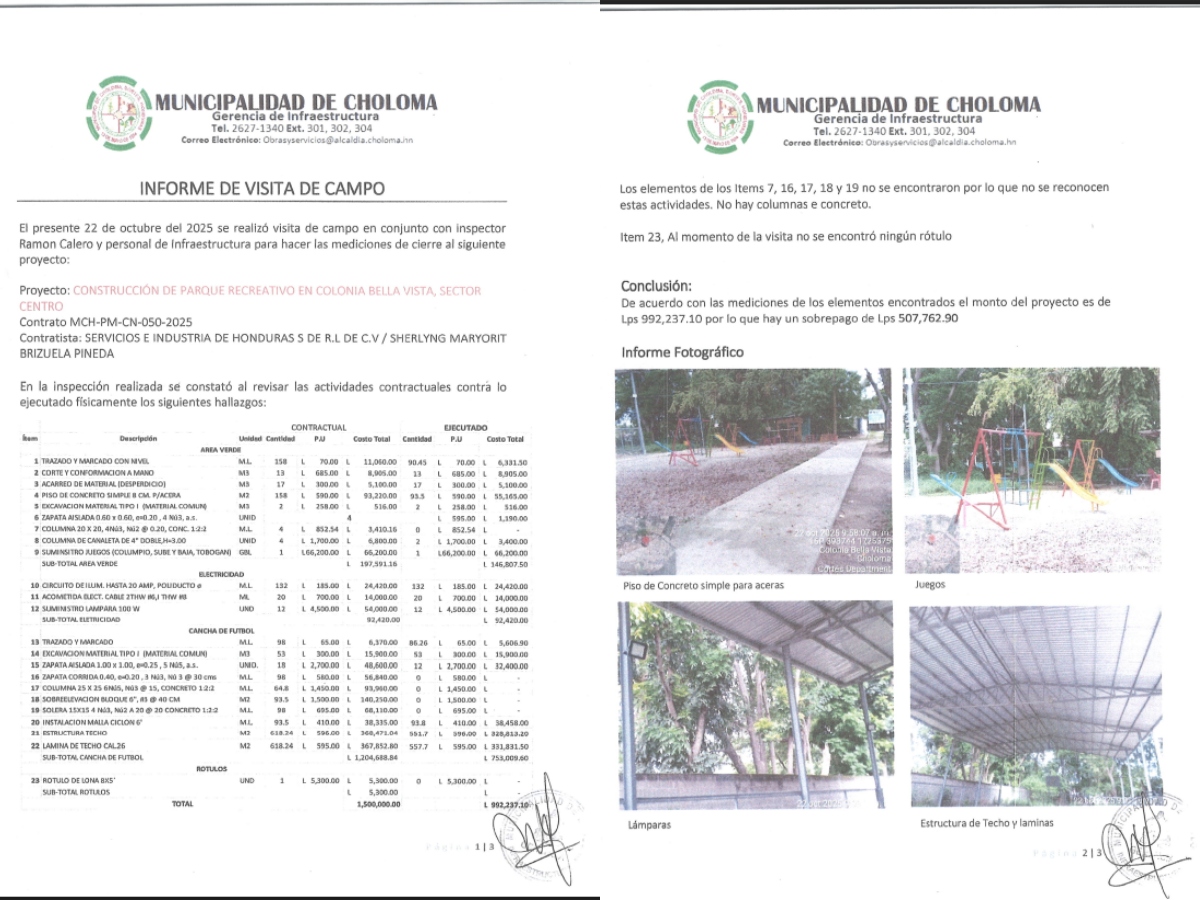 “De acuerdo con las mediciones de los elementos encontrados, el monto del proyecto es de L992,237.10, por lo que hay un sobrepago de L507,762.90”, señala el informe.