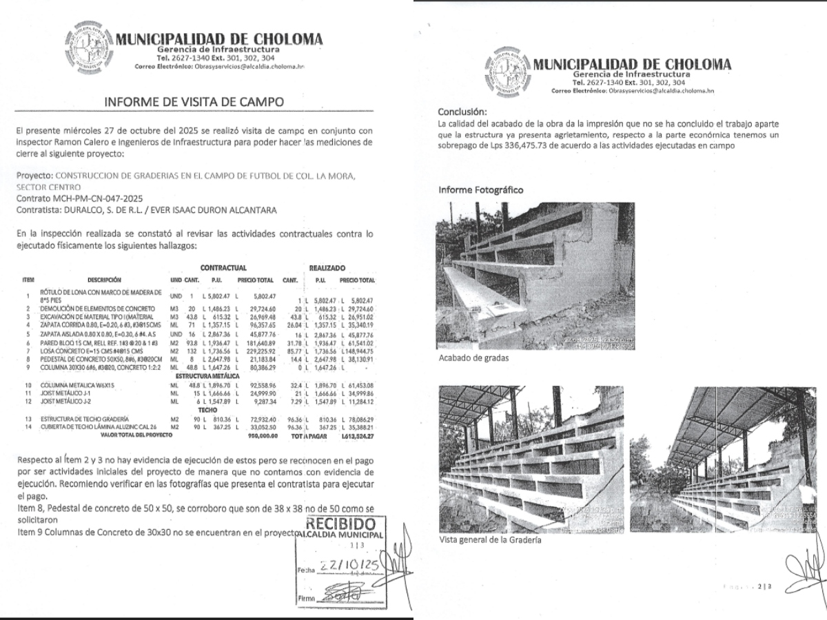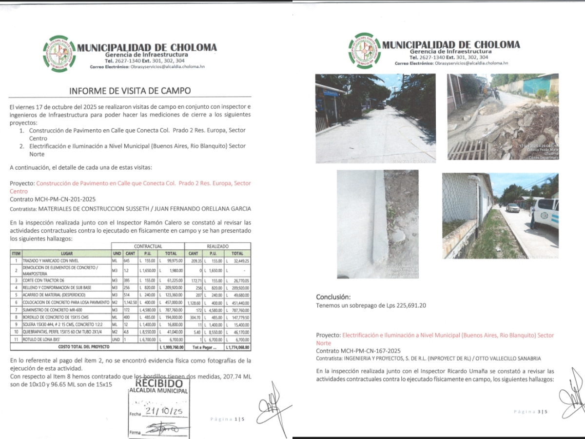 El equipo determinó que esta obra presenta un sobrepago de L225,691.20, además de hallazgos adicionales que refuerzan las sospechas: