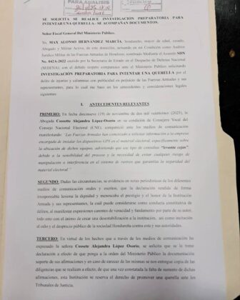 Redacción. Las Fuerzas Armadas de Honduras (FFAA) presentaron ante el Ministerio Público una solicitud formal de investigación preparatoria para interponer querella por los presuntos delitos de injurias y calumnias con publicidad contra Cossette Alejandra López Osorio, consejera del Consejo Nacional Electoral (CNE).