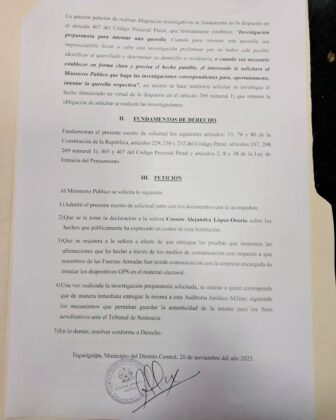 El Auditor Jurídico Militar sostiene que estas afirmaciones son “carentes de veracidad y fundamento”. Asimismo, que podrían generar desconfianza pública, incitar al desprecio social y afectar la estabilidad institucional. Por ello, solicita que el Ministerio Público: