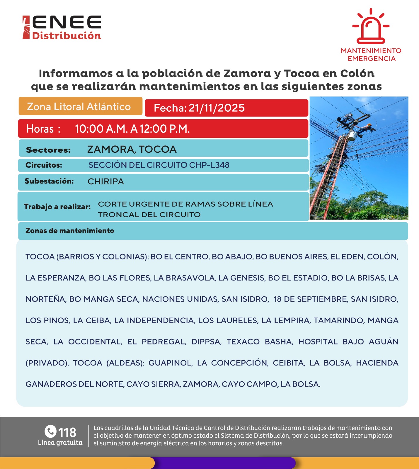 No obstante, se recomienda mantenerse atento a los canales oficiales de la ENEE, ya que en ocasiones los mantenimientos de emergencia se comunican el mismo día o un día antes, como ha ocurrido en jornadas recientes.
