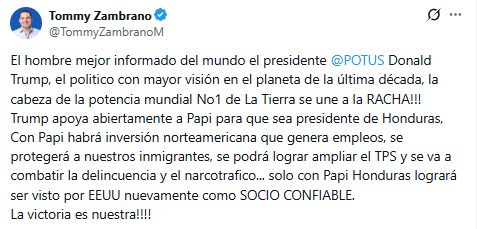 «Trump apoya abiertamente a Papi para que sea presidente de Honduras. Con Papi habrá inversión norteamericana que genera empleos, se protegerá a nuestros inmigrantes, se podrá lograr ampliar el TPS y se va a combatir la delincuencia y el narcotráfico», escribió.
