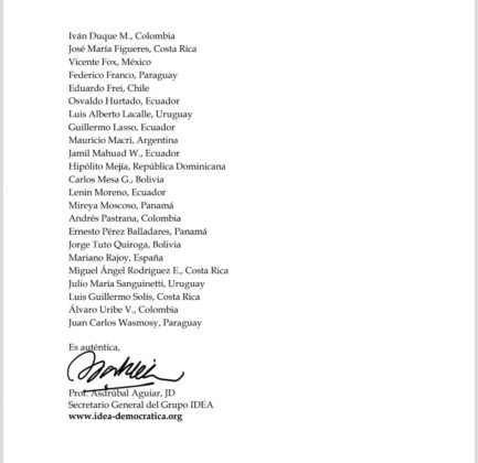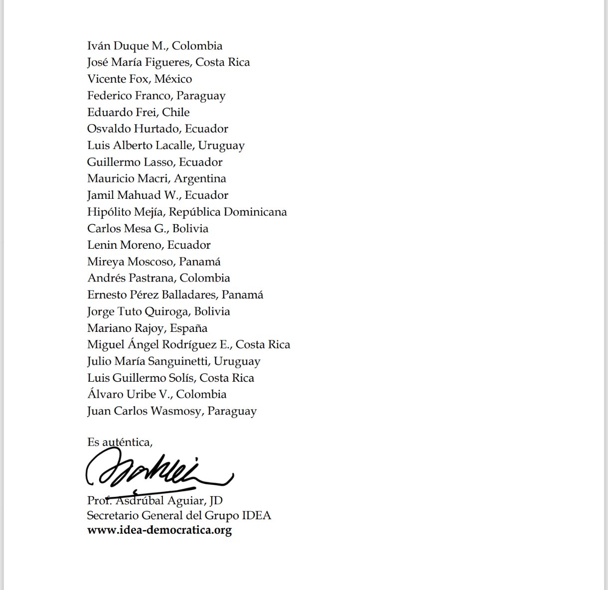 Entre los firmantes figuran José María Aznar, Laura Chinchilla, Álvaro Uribe y Vicente Fox. También, Mauricio Macri, Luis Alberto Lacalle, Guillermo Lasso y Jorge Tuto Quiroga, entre otros.