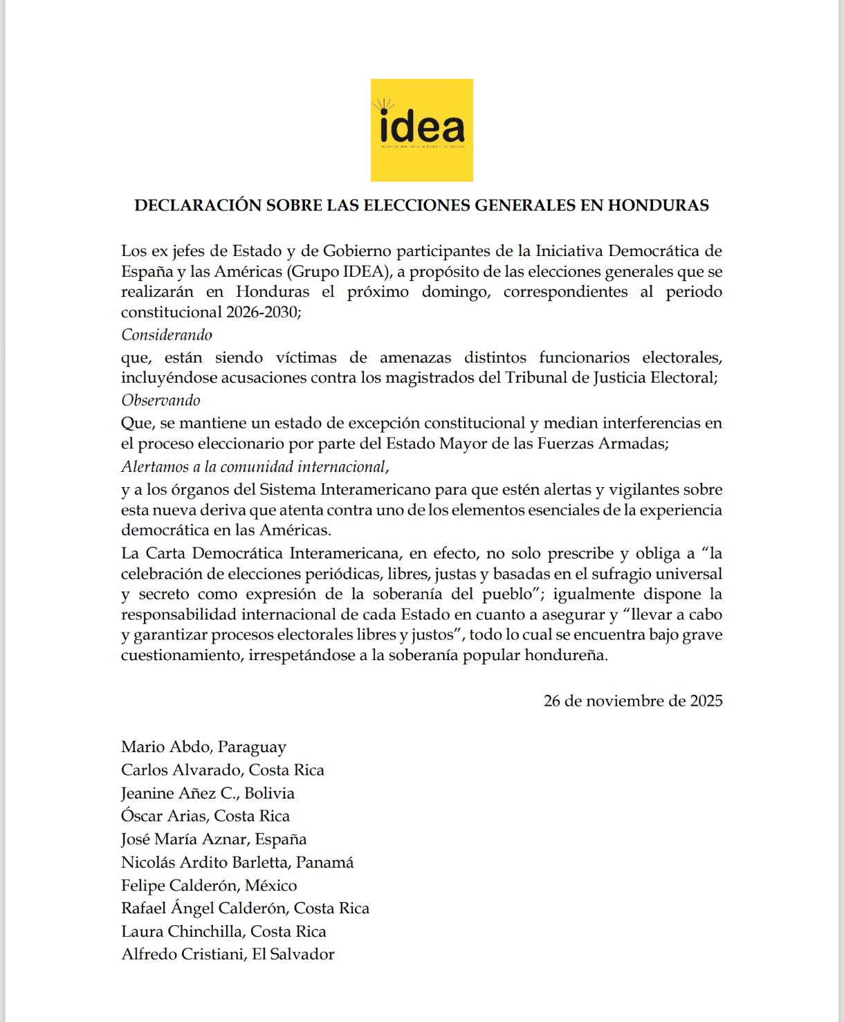 Redacción. Un grupo de expresidentes iberoamericanos integrantes de la Iniciativa Democrática de España y las Américas (Grupo IDEA) —entre ellos Mariano Rajoy y Felipe Calderón— advirtió este jueves que las condiciones para celebrar elecciones “libres y justas” en Honduras están “seriamente comprometidas”.