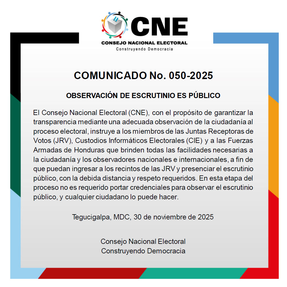 La instrucción se extendió a las Fuerzas Armadas de Honduras, recordándoles su responsabilidad de facilitar el ingreso de la ciudadanía y de los observadores nacionales e internacionales a los recintos donde se realiza el escrutinio.