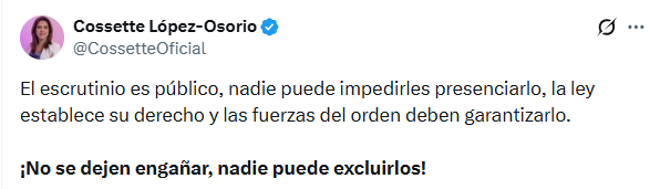 “El escrutinio es público, nadie puede impedirles presenciarlo; la ley establece su derecho y las fuerzas del orden deben garantizarlo. ¡No se dejen engañar, nadie puede excluirlos!”, escribió López en su cuenta de X, al subrayar la obligación legal de permitir la supervisión ciudadana durante esta fase del proceso electoral.