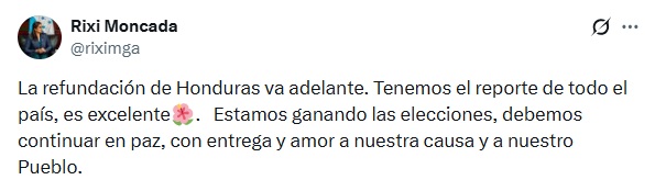 A través de su cuenta oficial en X, Moncada escribió: “La refundación de Honduras va adelante. Tenemos el reporte de todo el país y es excelente. Estamos ganando las elecciones«.