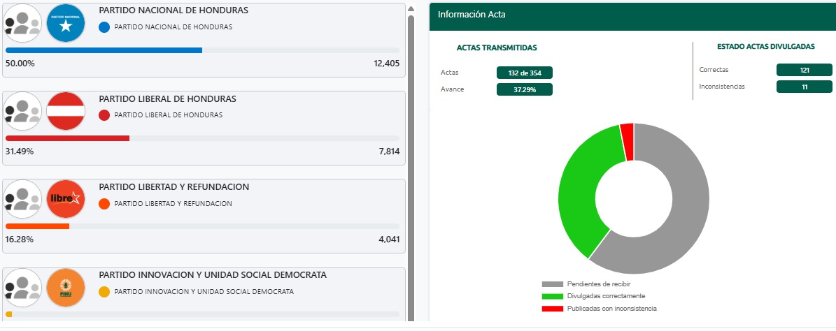 De acuerdo con los números oficiales, en la sultana del sur se han cotejado 132 de 354 actas, lo que significa un avance del 37.29%. A pesar de que aún falta más de un 60%, el triunfo es para el Partido Nacional.