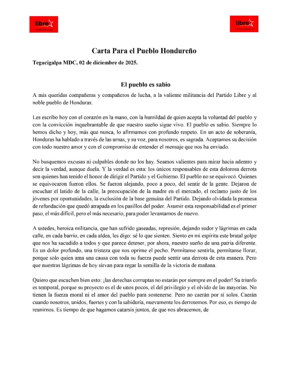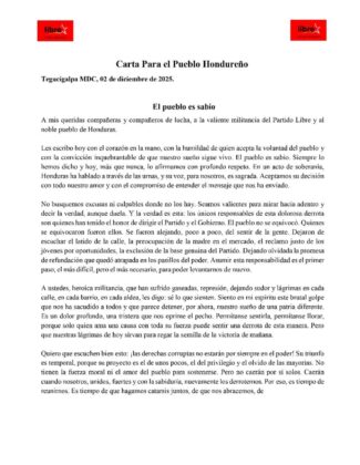 Tomé comenzó su comunicado apelando a la mesura. “Les escribo hoy con el corazón en la mano, con la humildad de quien acepta la voluntad del pueblo y con la convicción inquebrantable de que nuestro sueño sigue vivo”, afirmó, tras subrayar que “Honduras ha hablado a través de las urnas y su voz es sagrada para nosotros”.