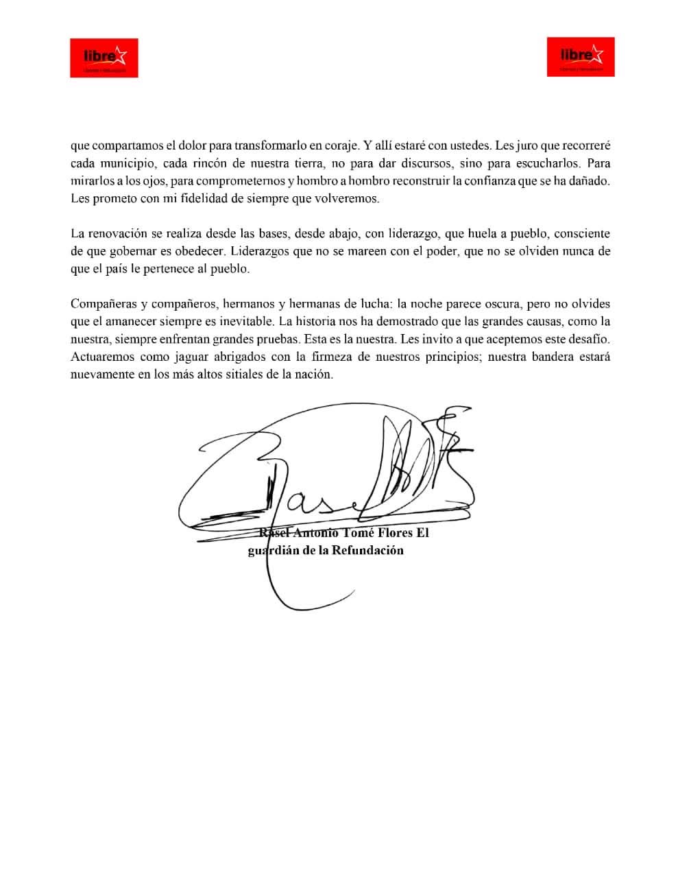 Redacción. El vicepresidente del Congreso Nacional y dirigente del partido Libertad y Refundación (Libre, en el gobierno), Rasel Tomé, emitió un mensaje este martes al pueblo hondureño y a su base partidaria tras la reciente derrota electoral.