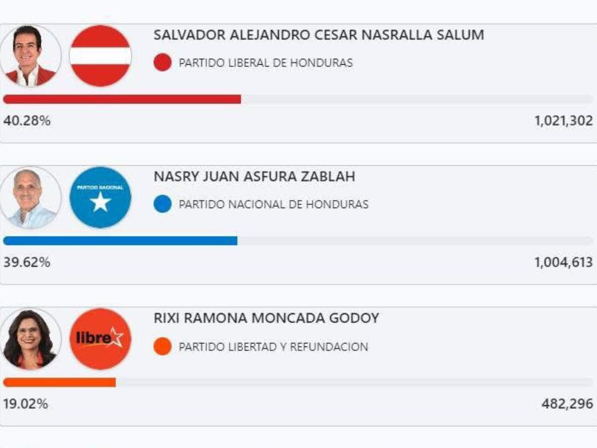 Con el 79.42 % de las actas procesadas —15,207 de 19,152—, el candidato del Partido Liberal, Salvador Nasralla, continúa liderando la contienda presidencial. Hasta las 10:51 de la mañana, Nasralla mostraba 1,021,302 votos, equivalentes al 40.28 % del total, según datos divulgados este miércoles.
