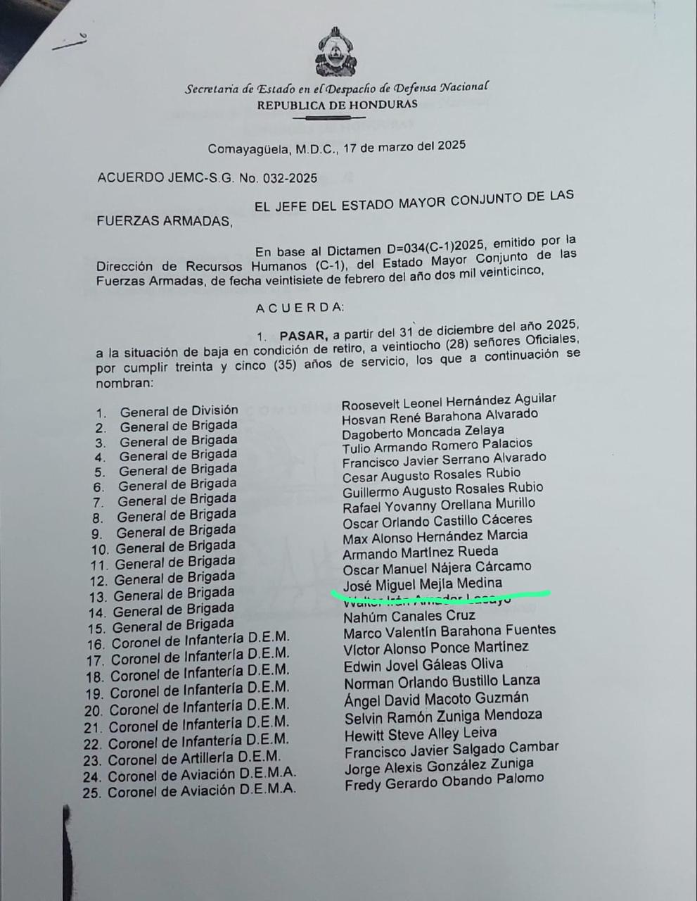 El retiro ocurre también tras el desarrollo de las elecciones generales en Honduras y un próximo cambio de gobierno que iniciará el 27 de enero de 2026. A mediados de diciembre, el Estado Mayor Conjunto tendrá nuevo jefe, al igual que los demás mandos.