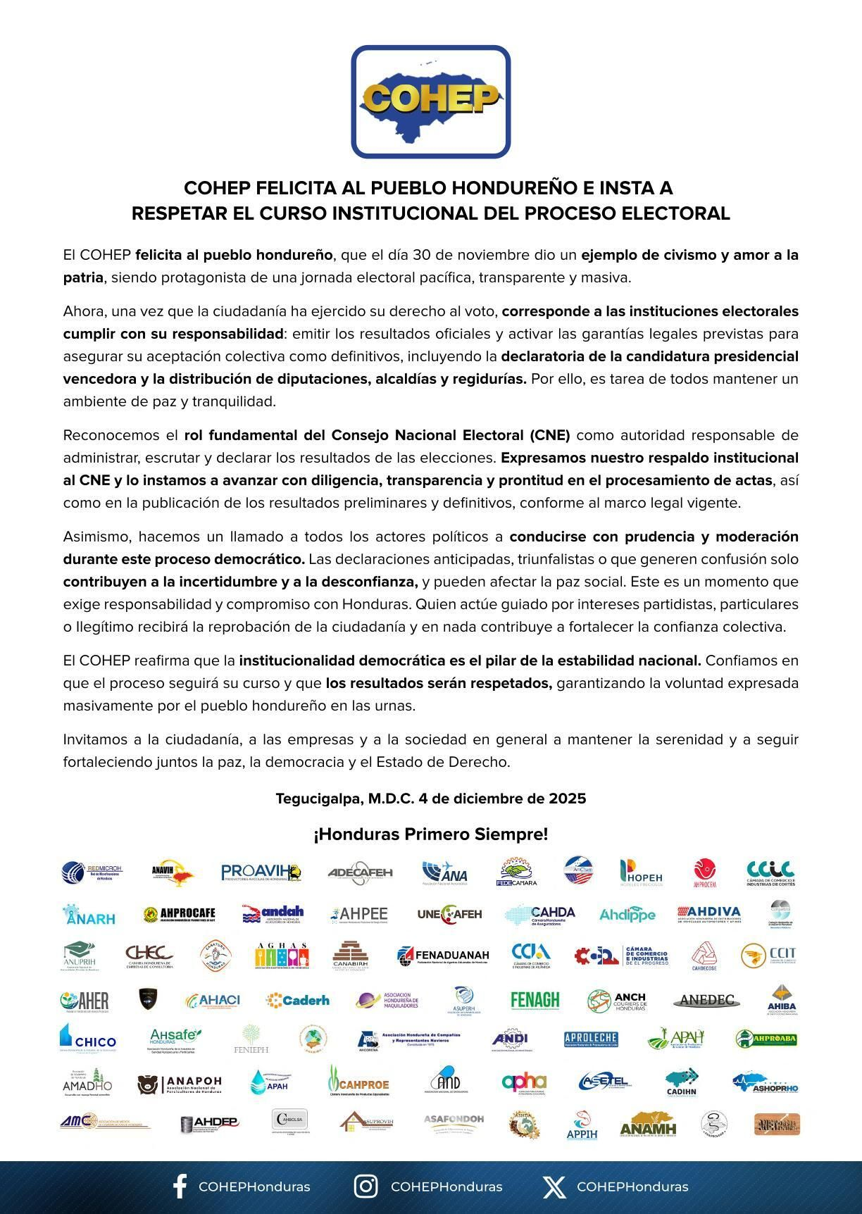 Redacción. El Consejo Hondureño de la Empresa Privada (Cohep) hizo un llamado este jueves a la prudencia de los candidatos en todos los niveles electorales, para que no se autoproclamen ganadores antes de que se emitan los resultados oficiales de las elecciones generales 2025.
