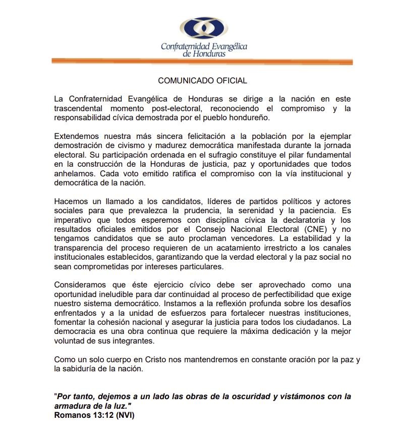 Redacción. La Confraternidad Evangélica de Honduras hizo un llamado urgente a la paz, la prudencia y la paciencia de los líderes políticos y sociales del país, ante la espera de los resultados oficiales del Consejo Nacional Electoral (CNE).