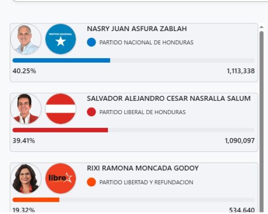 En el momento en que se produjo la transmisión, Salvador Nasralla lideraba el conteo con 1,066,319 votos. Mientras, Nasry Asfura se encontraba detrás con 1,065,646, lo que representaba una diferencia de solo 673 votos.