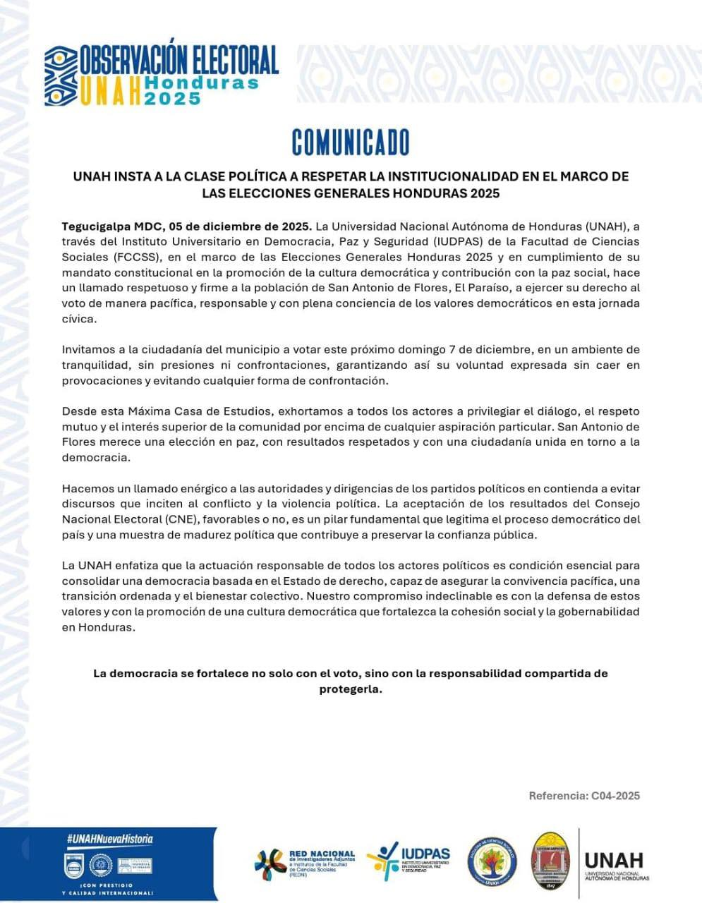 Redacción. La Universidad Nacional Autónoma de Honduras (UNAH) realizó un llamado a la población de San Antonio de Flores, El Paraíso, para que ejerza su derecho al voto de manera pacífica y responsable el próximo domingo 7 de diciembre, fecha en la que se repetirán las elecciones generales en ese municipio.