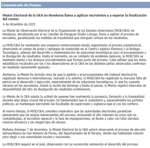 Además, la MOE-OEA reportó que este domingo 7 de diciembre observará la repetición de las elecciones en San Antonio de Flores, El Paraíso.