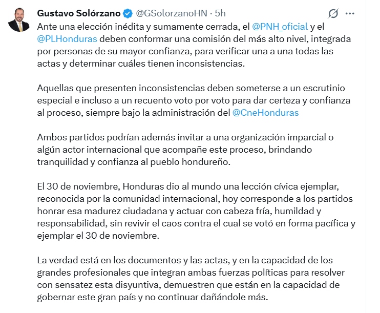 “Ambos partidos podrían invitar a una organización imparcial o algún actor internacional que acompañe este proceso, brindando tranquilidad y confianza al pueblo hondureño”, añadió.