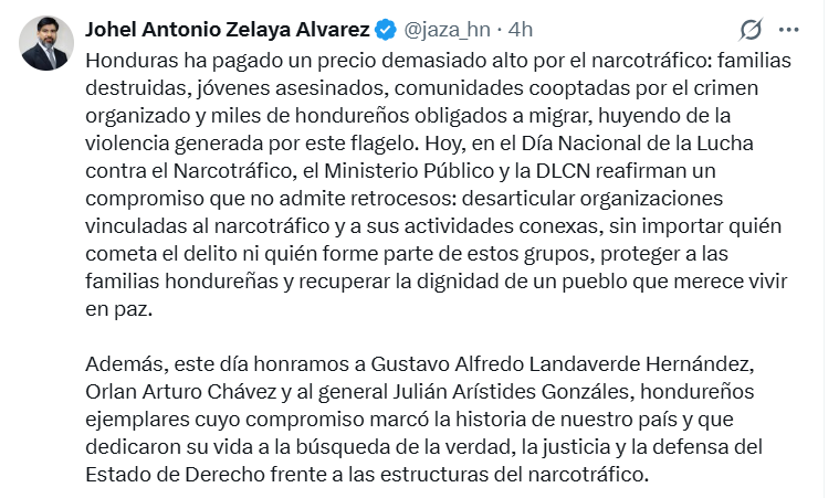 Zelaya concluyó que el Día Nacional de la Lucha contra el Narcotráfico recuerda los sacrificios que hicieron las personas y refleja el compromiso del Estado de garantizar la seguridad de la población y la paz en Honduras.
