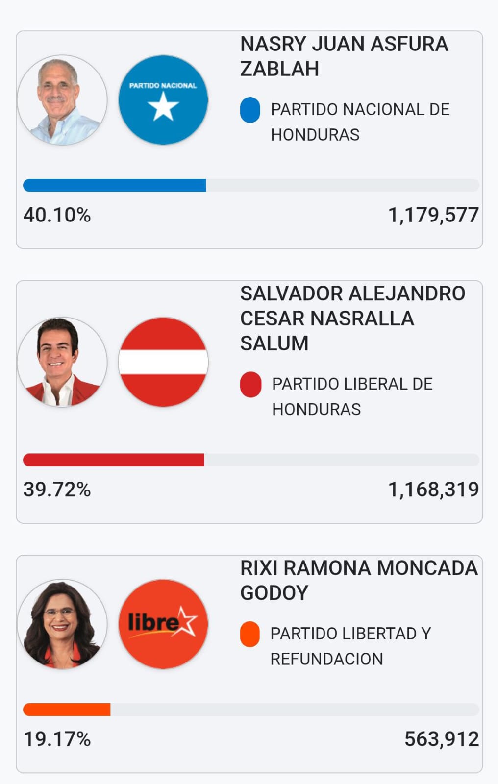 Los últimos datos oficiales del CNE reflejan que el candidato del Partido Nacional de Honduras, Nasry Juan Asfura Zablah, suma 1,179,577 votos. De su lado, Salvador Alejandro César Nasralla Salum, del Partido Liberal de Honduras, registra 1,168,319 votos.