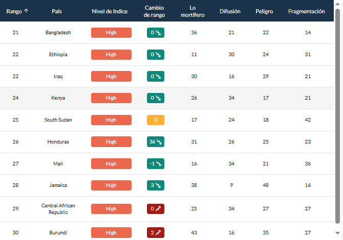 Entre los países más afectados se encuentran también Birmania y Siria, seguidos por México, que ocupa el cuarto lugar, y Ecuador, que escaló 36 posiciones en comparación con el año anterior, alcanzando el sexto puesto.