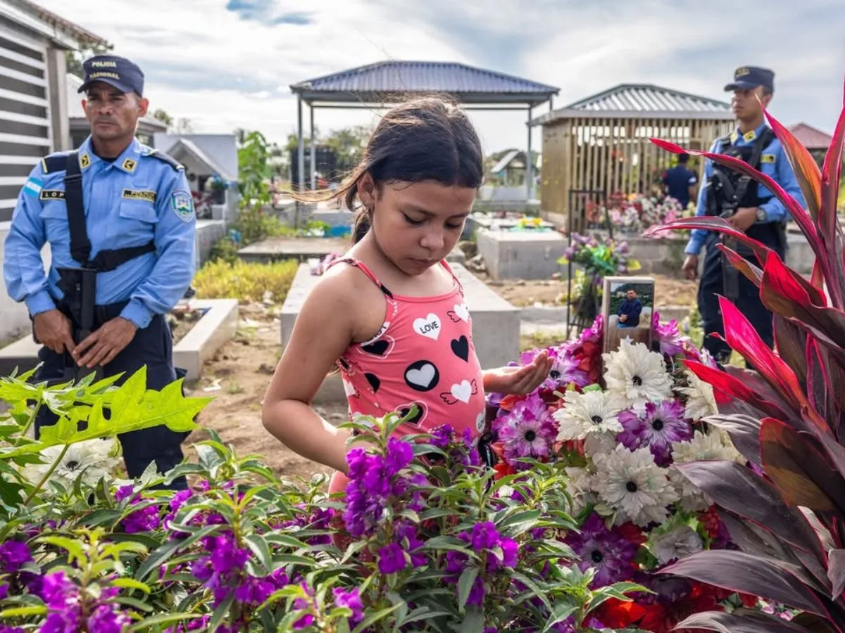 La conmovedora imagen muestra a Julia López, una niña de nueve años, mientras visita la tumba de su padre, Juan López, un respetado líder comunitario y defensor del medio ambiente que fue trágicamente asesinado en 2024. La escena íntima y sombría muestra a la menor rodeada de flores y de elementos de la Policía Nacional.