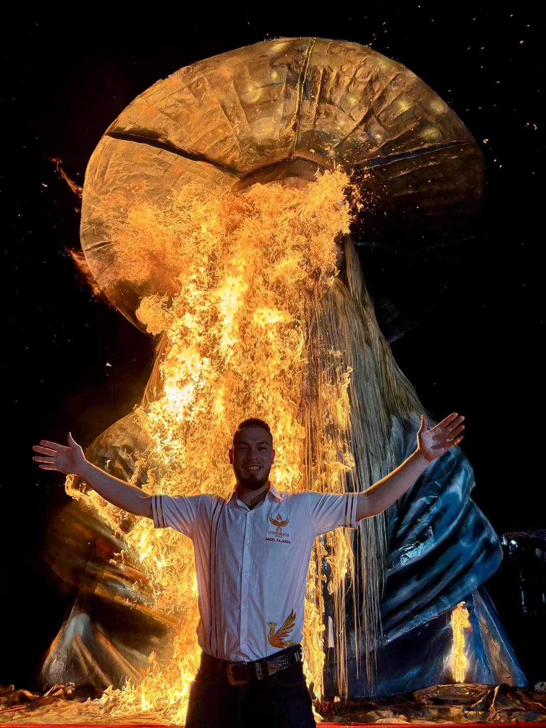 La ilusión del fuego llama la atención de los asistentes y todo el proceso se desarrolla bajo estrictas medidas de seguridad. Una vez que las llamas consumen toda la chimenea, queda la estructura metálica, que simboliza el renacer y se mantiene en pie como el ave fénix.