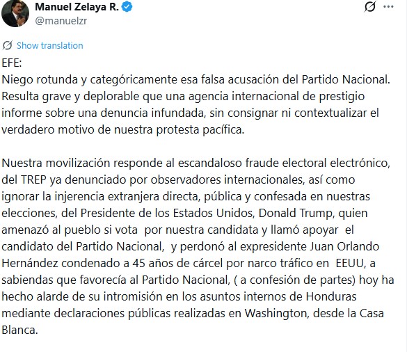 “Niego rotunda y categóricamente esa falsa acusación del Partido Nacional. Resulta grave y deplorable que una agencia internacional de prestigio informe sobre una denuncia infundada, sin consignar ni contextualizar el verdadero motivo de nuestra protesta pacífica”, expresó Zelaya.