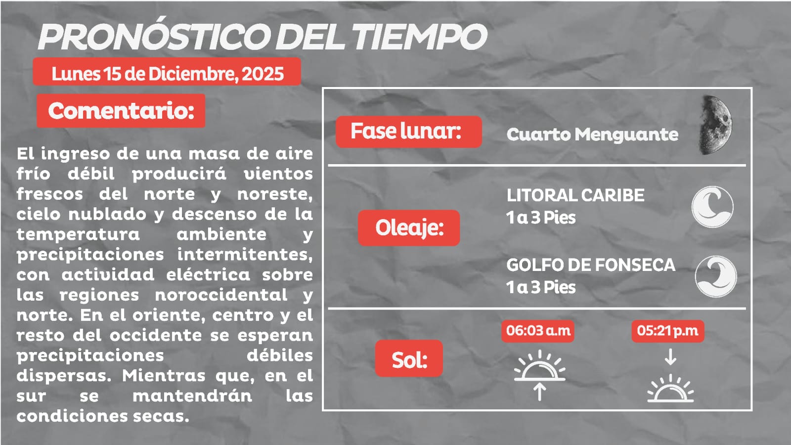 Redacción. El Centro Nacional de Estudios Atmosféricos, Oceanográficos y Sísmicos (Cenaos) dio a conocer el pronóstico del tiempo para este lunes 15 de diciembre en todo el territorio nacional.