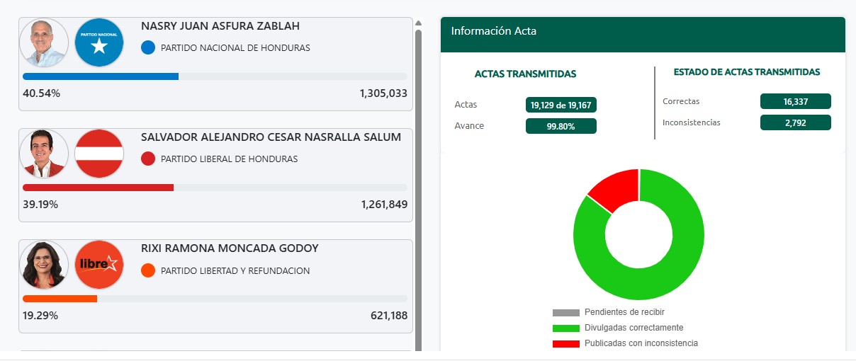 El Consejo Nacional Electoral (CNE) informó que, con el 99.80 % de las actas procesadas, Nasry Asfura, candidato del Partido Nacional (PN), mantiene una ventaja preliminar sobre Salvador Nasralla, del Partido Liberal (PL), en las elecciones presidenciales del 30 de noviembre.