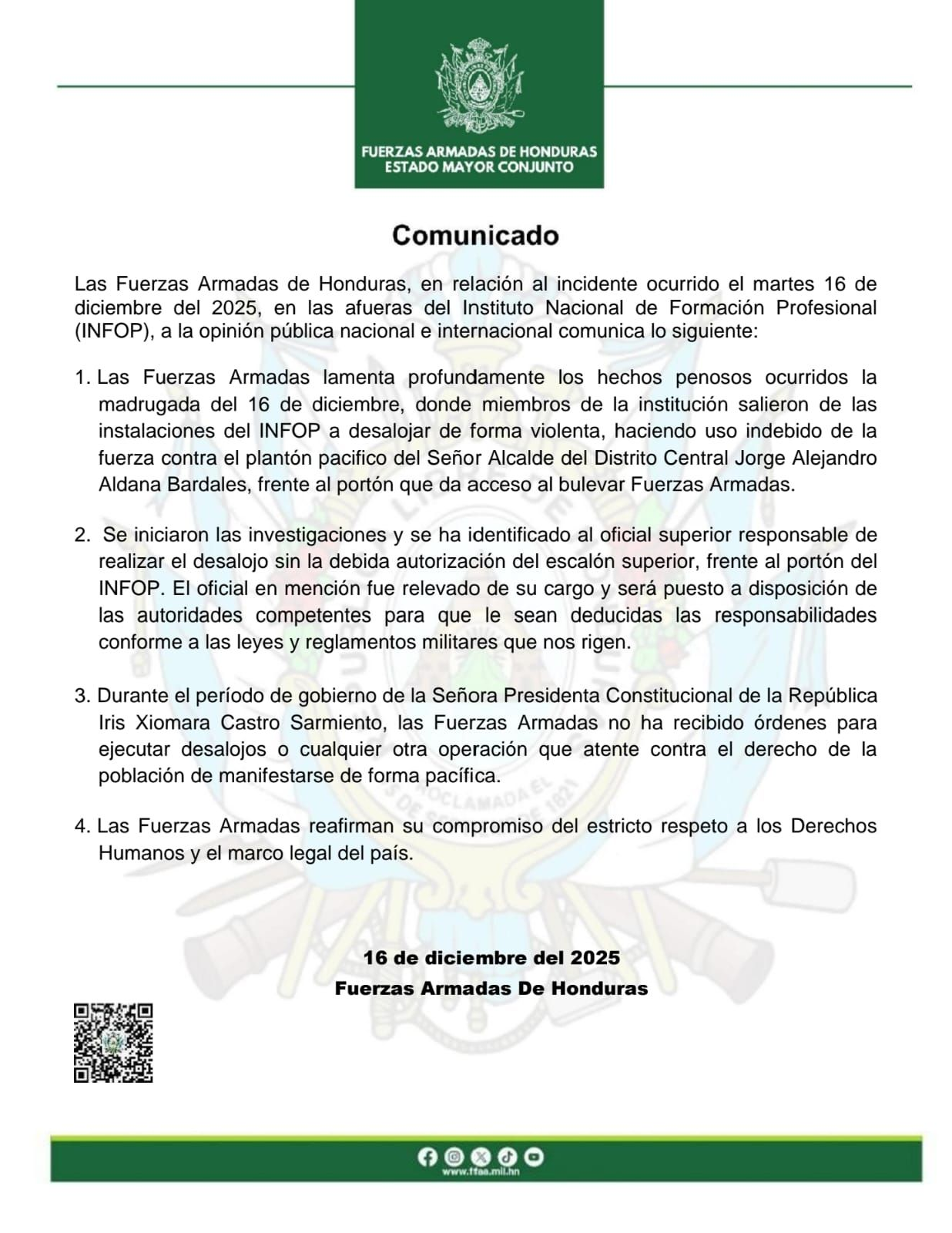En un comunicado oficial, la institución castrense expresó su pesar por los hechos ocurridos este martes, en los cuales miembros de las Fuerzas Armadas intervinieron de manera violenta para dispersar a los manifestantes encabezados por el alcalde del Distrito Central, Jorge Aldana.