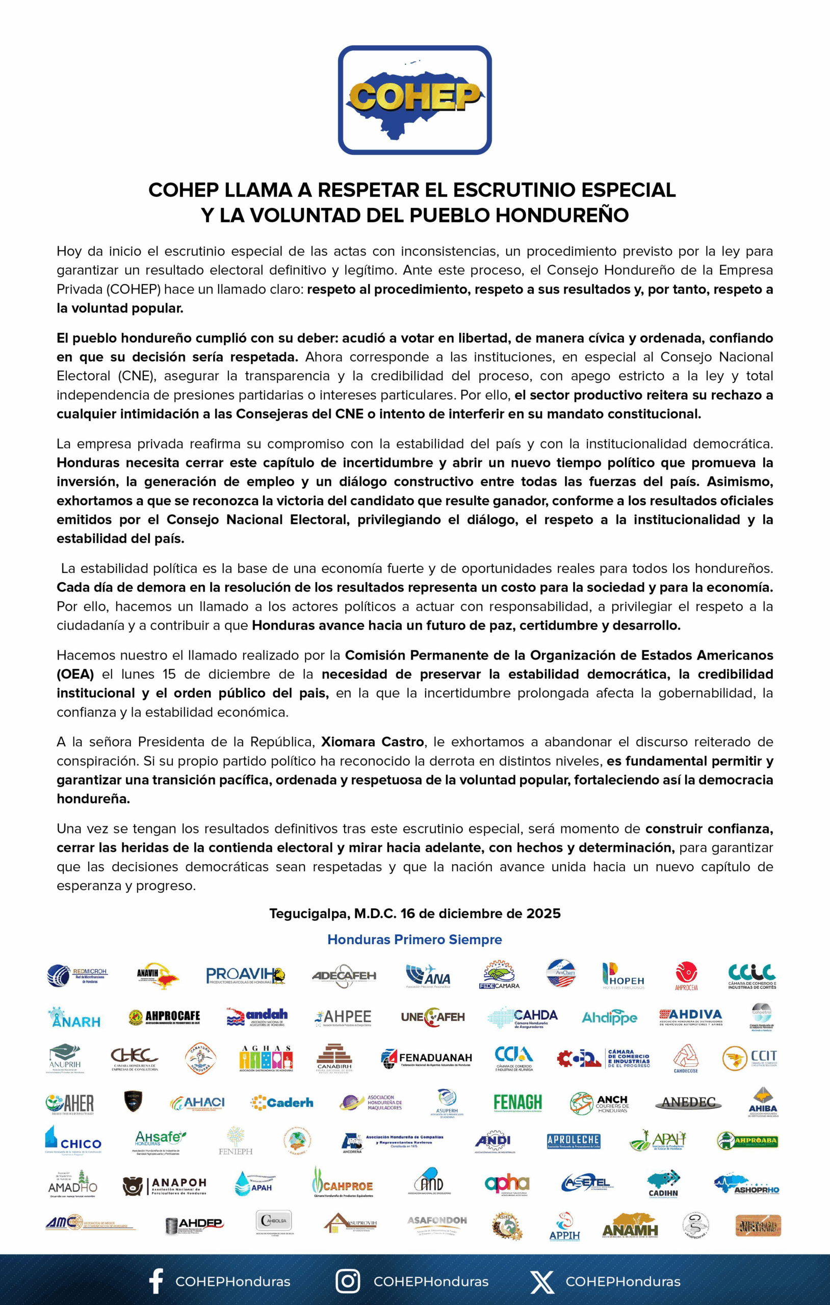 Redacción. El Consejo Hondureño de la Empresa Privada (Cohep) emitió un llamado a las autoridades políticas del país, instando a que se respete el procedimiento electoral y sus resultados que reflejan la voluntad popular.