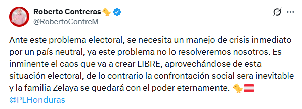 Contreras expresó que la crisis política requiere de un manejo inmediato y externo. «Ante este problema electoral, se necesita un manejo de crisis inmediato por un país neutral, ya que este problema no lo resolveremos nosotros», manifestó en su cuenta de X.