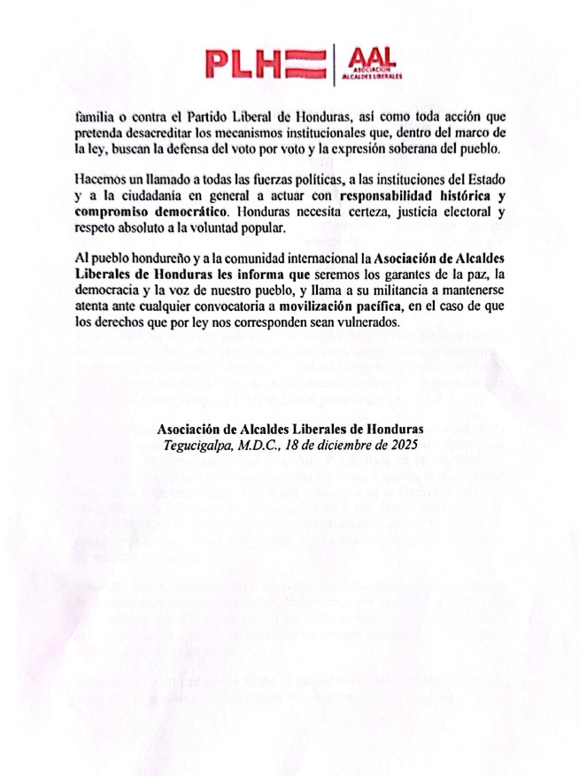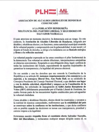 Redacción. La Asociación de Alcaldes Liberales de Honduras emitió un comunicado dirigido a la ciudadanía y a la militancia del Partido Liberal, en el que respalda a Salvador Nasralla y exige respeto absoluto a la voluntad popular expresada en las urnas.