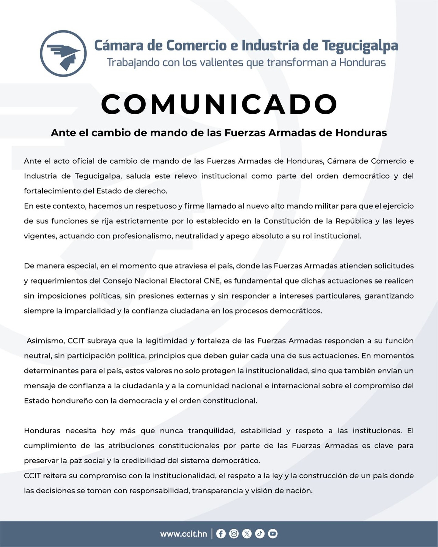 Redacción. La Cámara de Comercio e Industria de Tegucigalpa (CCIT) expresó su apoyo al relevo en la cúpula militar, encabezado por el general Héctor Benjamín Valerio Ardón, quien asumió el mando este jueves.