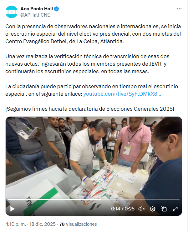Tegucigalpa, Honduras. La consejera presidenta del Consejo Nacional Electoral (CNE), Ana Paola Hall, informó que el escrutinio especial arrancó con dos maletas del nivel presidencial provenientes de La Ceiba.
