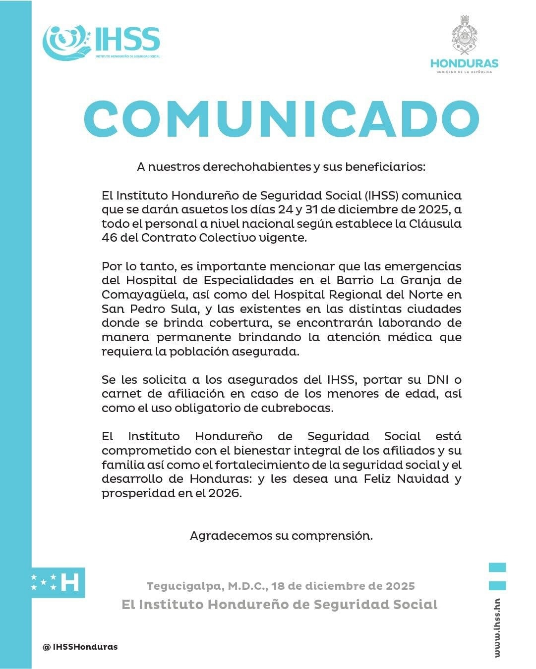Redacción. El Instituto Hondureño de Seguridad Social (IHSS) informó a sus derechohabientes, beneficiarios y población en general que los días miércoles 24 y 31 de diciembre de 2025 se otorgará asueto al personal administrativo a nivel nacional.