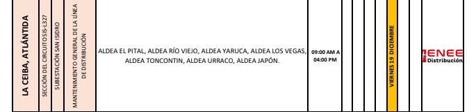 Asimismo, se programaron cortes de energía en La Ceiba (Atlántida), Santa Bárbara y otras zonas. El horario depende de cada área, según lo especificado en el boletín informativo de la ENEE.