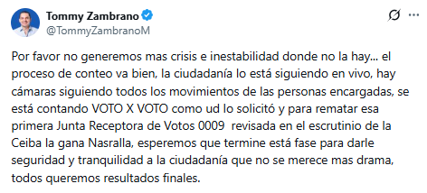«Por favor, no generemos más crisis e inestabilidad donde no la hay… el proceso de conteo va bien, la ciudadanía lo está siguiendo en vivo, hay cámaras siguiendo todos los movimientos de las personas encargadas, se está contando voto por voto como usted lo solicitó», manifestó Zambrano.