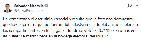 «Ha comenzado el escrutinio especial y resulta que la foto nos demuestra que hay papeletas que no fueron dobladas (si no se doblaban, no cabían en los compartimientos en los lugares donde se votó el 30/11). O sea, urnas en las cuales se metió votos en la bodega electoral del Infop», escribió Nasralla a través de su cuenta en X.