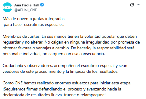 A través de un mensaje publicado en su cuenta oficial de X, Hall destacó la importancia del escrutinio especial y la responsabilidad de los miembros de las Juntas Especiales Receptoras de Votos (JERV), quienes tienen en sus manos «la voluntad popular».