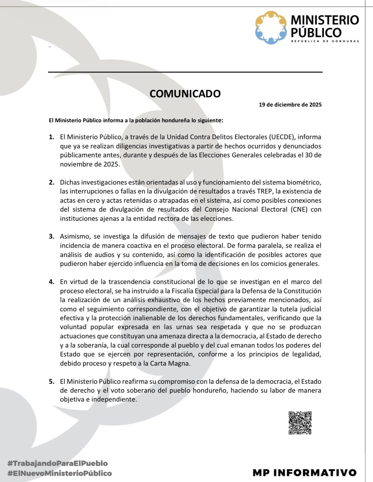 En este sentido, el MP subrayó la importancia de respetar la voluntad expresada por el pueblo hondureño en las urnas y de preservar los principios de legalidad.