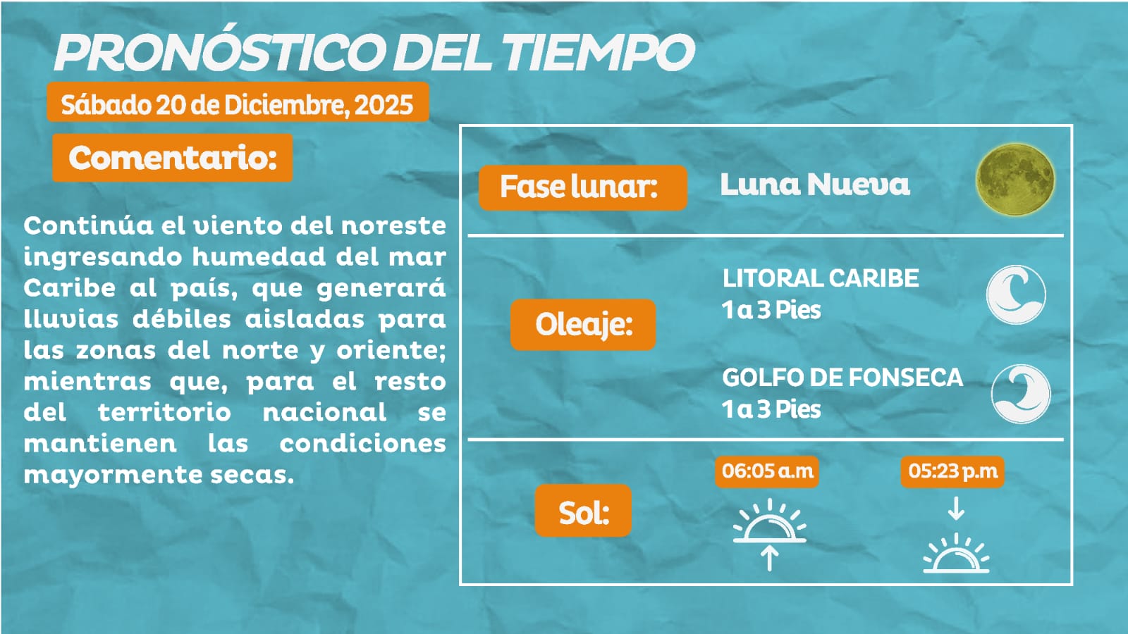 Redacción. El Centro Nacional de Estudios Atmosféricos, Oceanográficos y Sísmicos (Cenaos) emitió el pronóstico del tiempo para este sábado 20 de diciembre, destacando la continuación del viento del noreste que está ingresando humedad proveniente del mar Caribe hacia el territorio nacional.