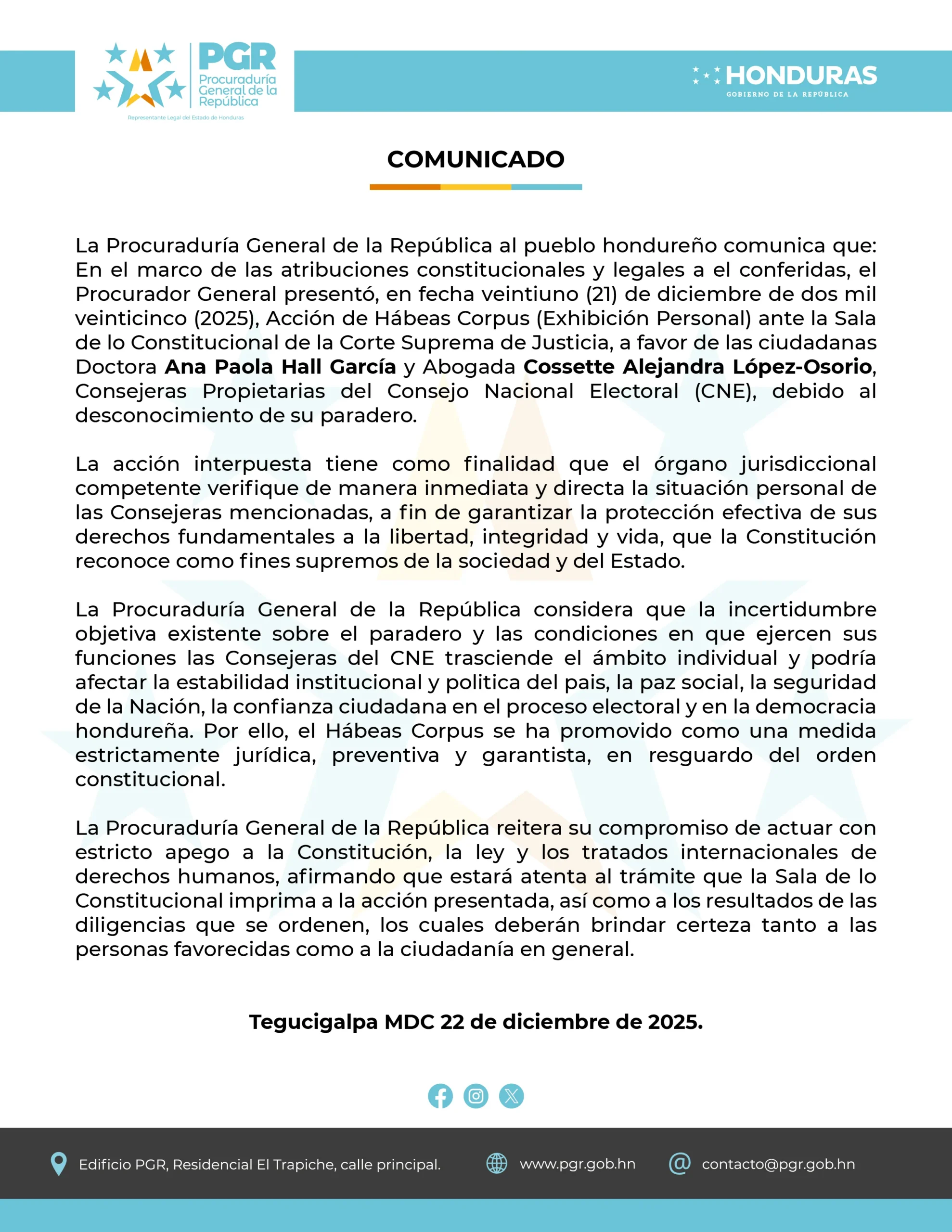 La Procuraduría fue enfática al advertir que la desaparición de las consejeras no es un hecho aislado, sino una amenaza directa a la estabilidad institucional de Honduras.