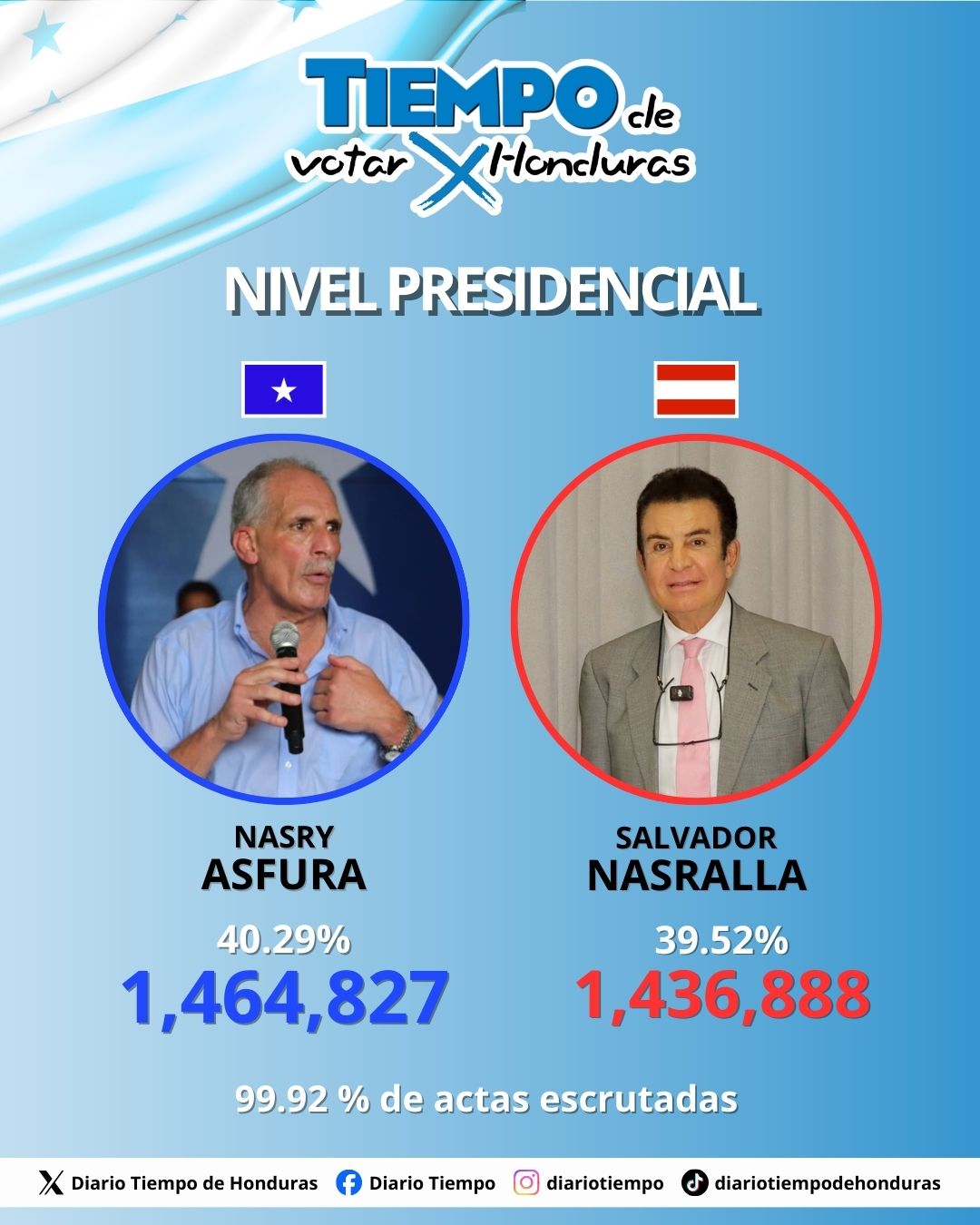 Con estos datos, Asfura acumula 1,464,827 votos, mientras que Nasralla suma 1,436,888. La diferencia entre ambos es de 27,939 sufragios.