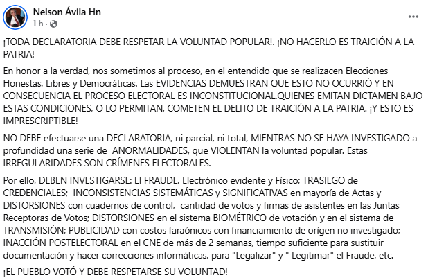 Redacción. El candidato presidencial por el Partido Innovación y Unidad Social Demócrata (PINU), Nelson Ávila, expresó este martes su rechazo a la próxima declaratoria oficial de los resultados de las elecciones generales celebradas el pasado 30 de noviembre.