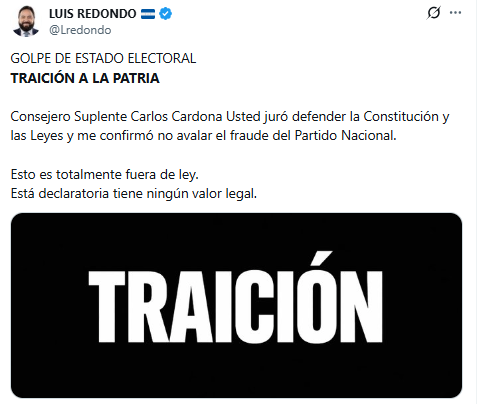 «Consejero suplente Carlos Cardona, usted juró defender la Constitución y las Leyes y me confirmó no avalar el fraude del Partido Nacional», expresó Redondo.